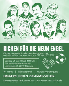 Am 22. Juli 2016, vor bald neun Jahren, wurden Armela, Can, Dijamant, Guiliano, Hüseyin, Roberto, Sabine, Selçuk und Sevda bei dem rechtsterroristischen Anschlag am OEZ ermordet. Viele von ihnen waren zum Zeitpunkt des Anschlags Jugendliche – begeistert vom Fußball. Can spielte sogar beim TSV Moosach-Hartmannshofen. Wir wollen mit dem Fußballturnier die neun Opfer in Erinnerung rufen.