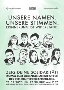 Kommt zum Gedenken und zeigt Eure Solidarität. Ankommen am 22.7.2025 ab 17 Uhr am OEZ in Moosach, Beginn der Gedenkveranstaltung ist um 17,30